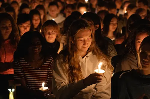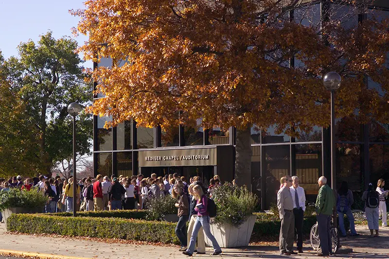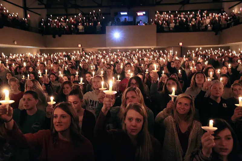 "On Tuesday, September 11, 2001, students and employees gathered to pray in Rediger Chapel after the terrorist attacks on New York City and Washington, DC. Multiple prayer gatherings were held across campus as the Taylor community grappled with the tragedy."