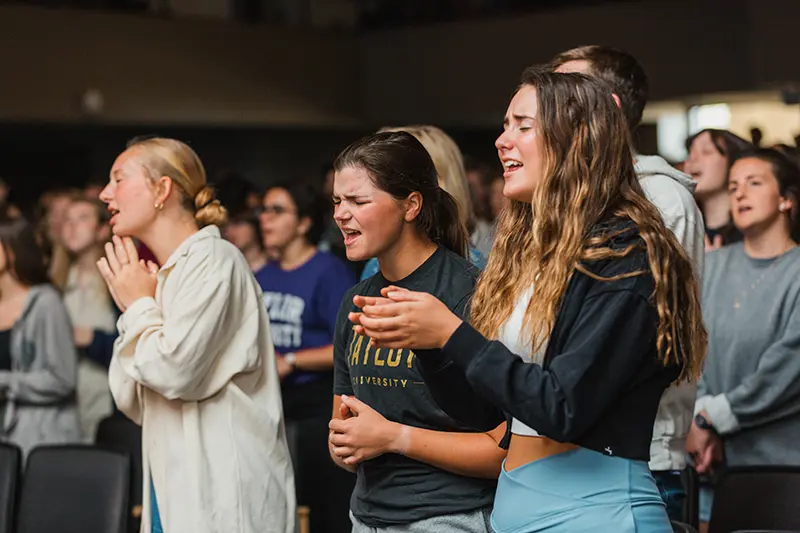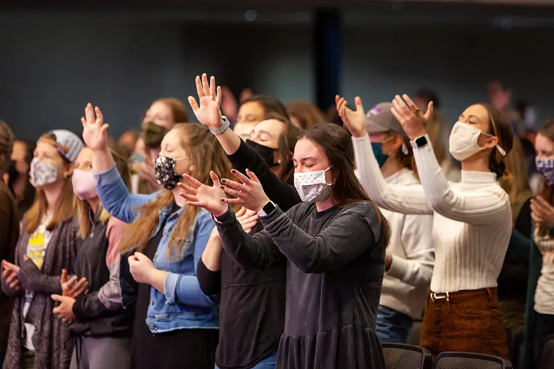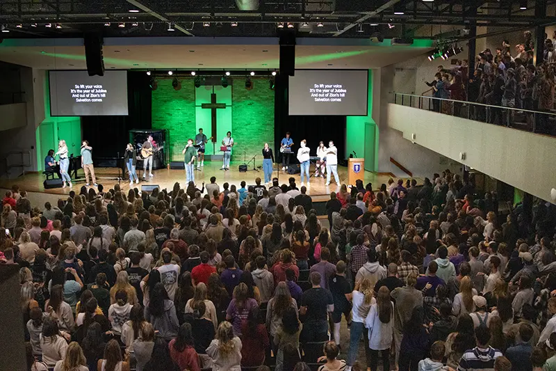 "From March–May 2020, chapel was held virtually when the campus was shut down due to the worldwide Covid-19 pandemic. The campus community tuned in to Instagram Live to hear Skye Jethani, Dr. Phil Collins, and many other speakers share from God’s Word. When students returned to campus in the fall, social distancing requirements called for a staggered approach with chapel attendance, with rotations determined by residence hall. In the fall of 2021, with restrictions lifting, the student body joyfully returned to worship together."